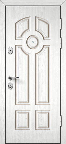 Входная железная дверь с белым цветом внешней панели и глубокой фрезеровкой на панели №13